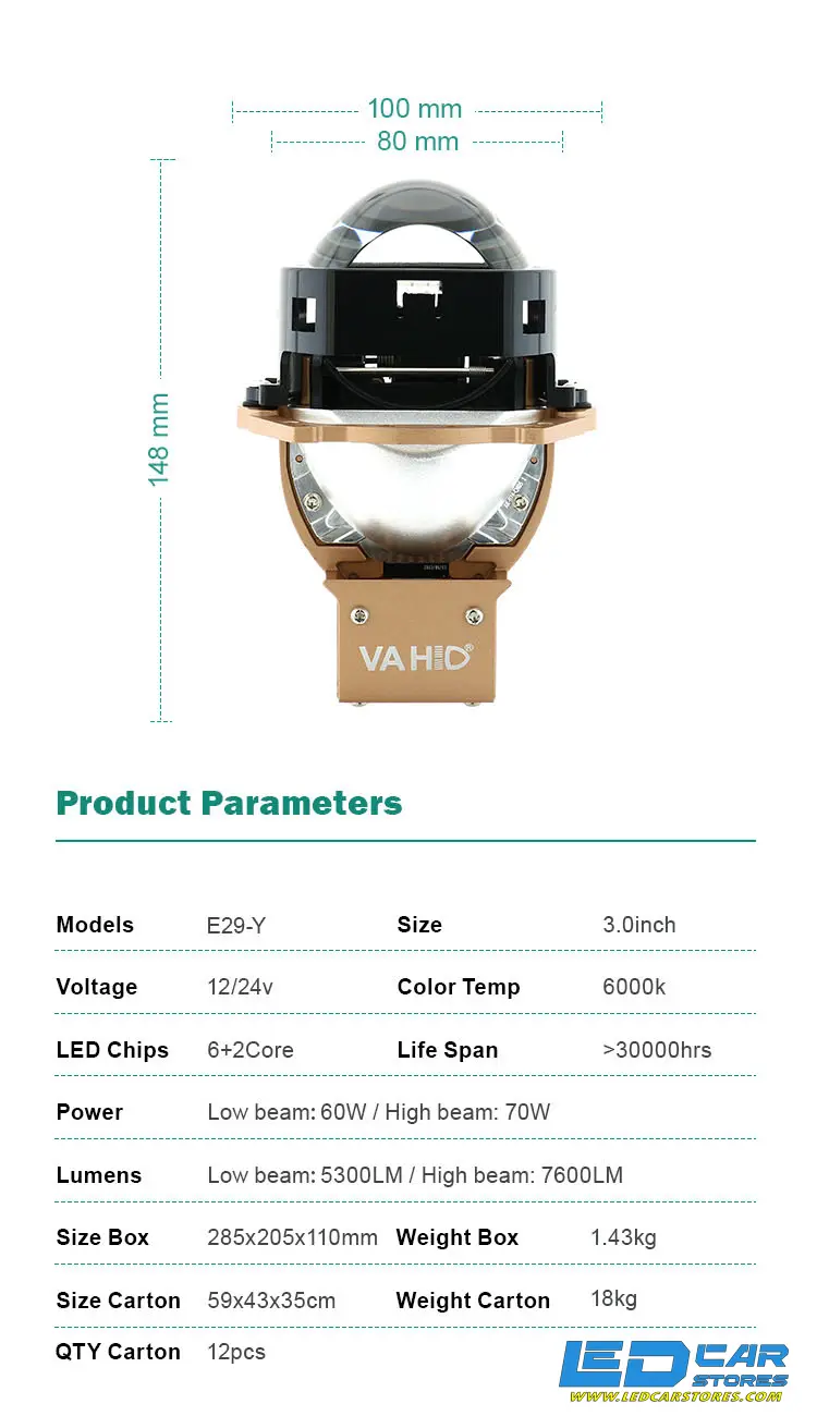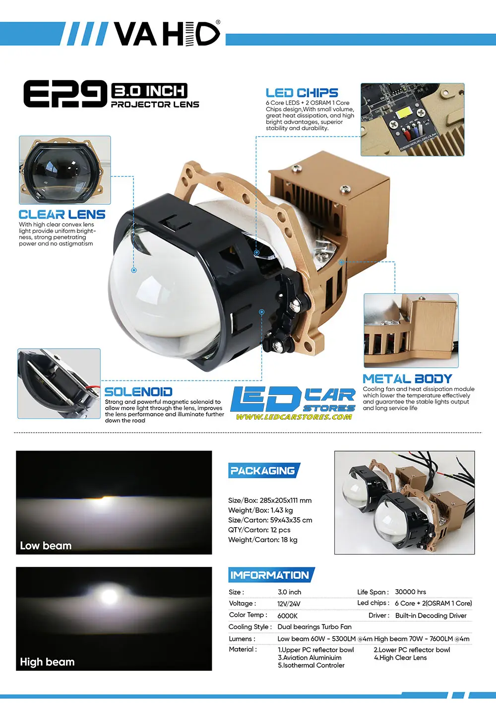 بروجيكتور LED سيارات Vahid E29 3.0 بوصة – إضاءة قوية 7600LM – عدسة واضحة – متوافق مع 12V/24V